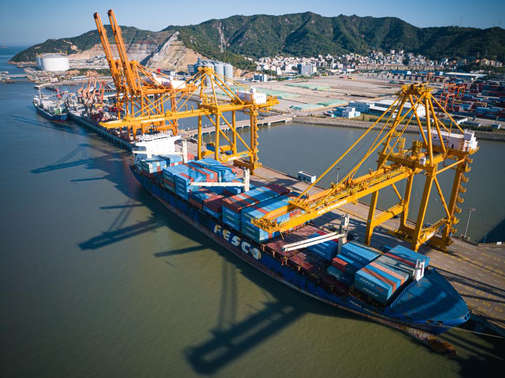 货轮停靠在温州港状元岙集装箱码头卸载集装箱(无人机照片,2023年11月22日摄)。新华社记者 江汉 摄