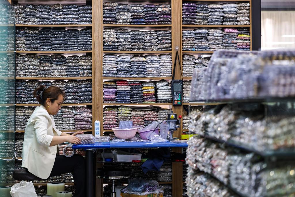 2025年3月,在温州永嘉县桥头商贸中心一家经营钮扣产品的店铺内,员工在打包钮扣产品。新华社记者 江汉 摄